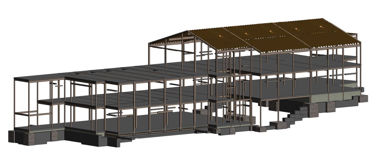 In order to overcome this issue we adopted a series of steel beams at foundation level which were supported on reinforced strip foundations set away from the existing foundations and cantilevered out to support the steel frame at the interface of the existing/proposed structures.